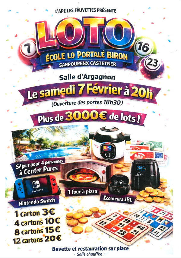 L'APE Les Fauvettes oragnise un loto le samedi 7 février à la salle d'Argagnon à 20h